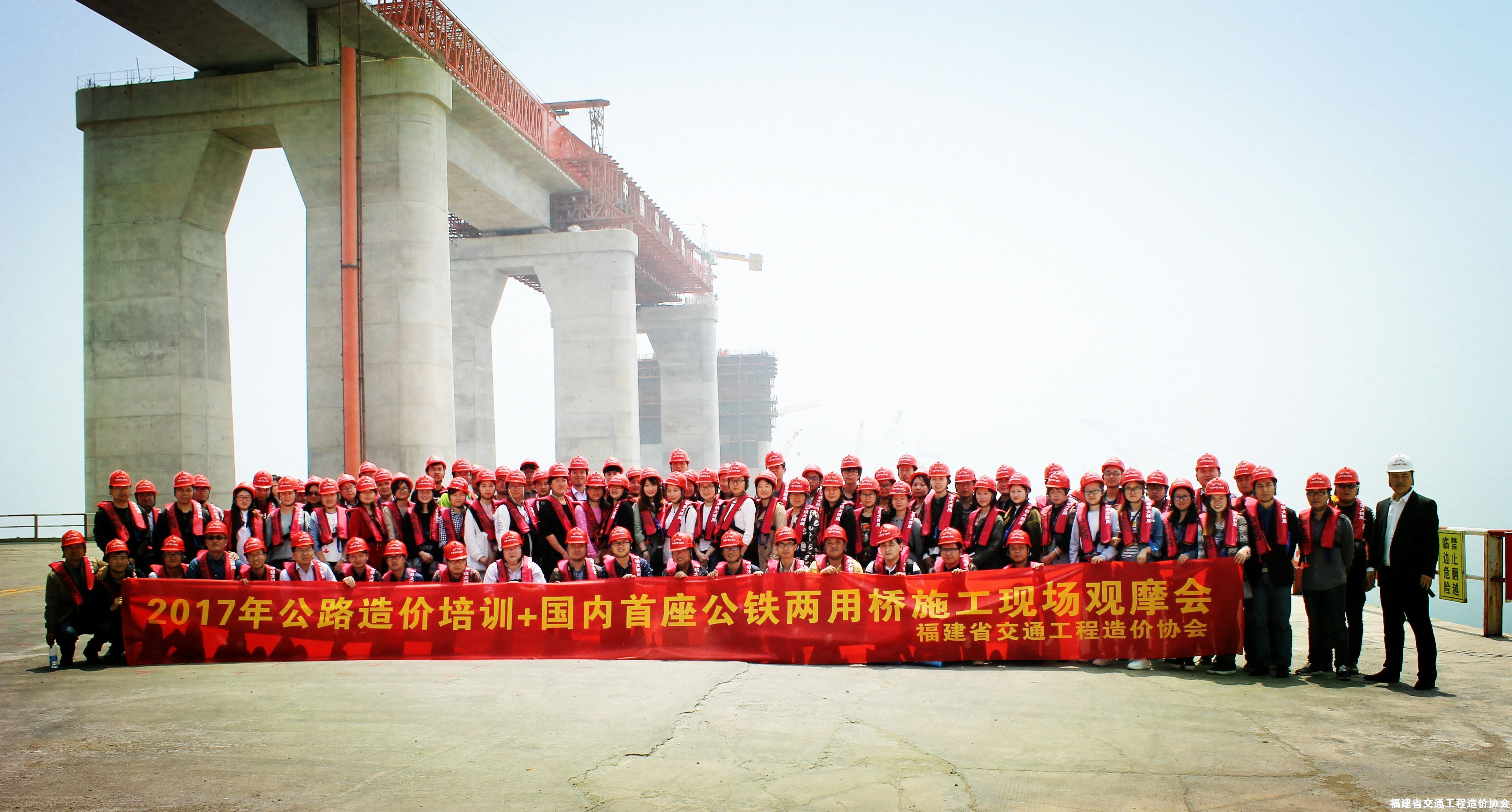 经过一个多小时的路途,终于到达了此次的观摩点,一下车,早已等候在此的中铁大桥局项目经理刘传志及他的同事热烈欢迎了大家的到来,并带领着大家到达第1个参观点---午山便道观景台,一览大桥的雄伟壮观!